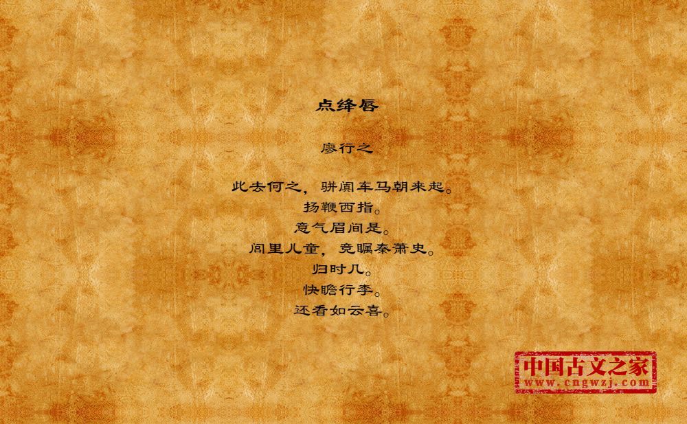 此去何之,骈阗车马朝来起。扬鞭西指。意气眉间是。闾里儿童,竞瞩秦萧史。归时几。快瞻行李。还看如云喜。