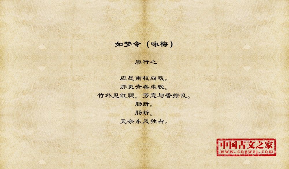 应是南枝向暖。那更青春未晚。竹外见红腮,芳意与香撩乱。肠断。肠断。无奈东风独占。