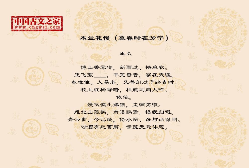 博山香雾冷,新雨过、怯单衣。正飞絮__,平芜杳杳,家在天涯。春难住、人易老,又等闲过了踏青时。枝上红稀绿暗,杜鹃刚向人啼。依依。谩叹歌生弹铗,尘满弦徽。想北山猿鹤,南溪鸥鹭,怪我归迟。青云事、今已晚,倚小窗、谁与话襟期。对酒有愁可解,擘笺无怨休题。