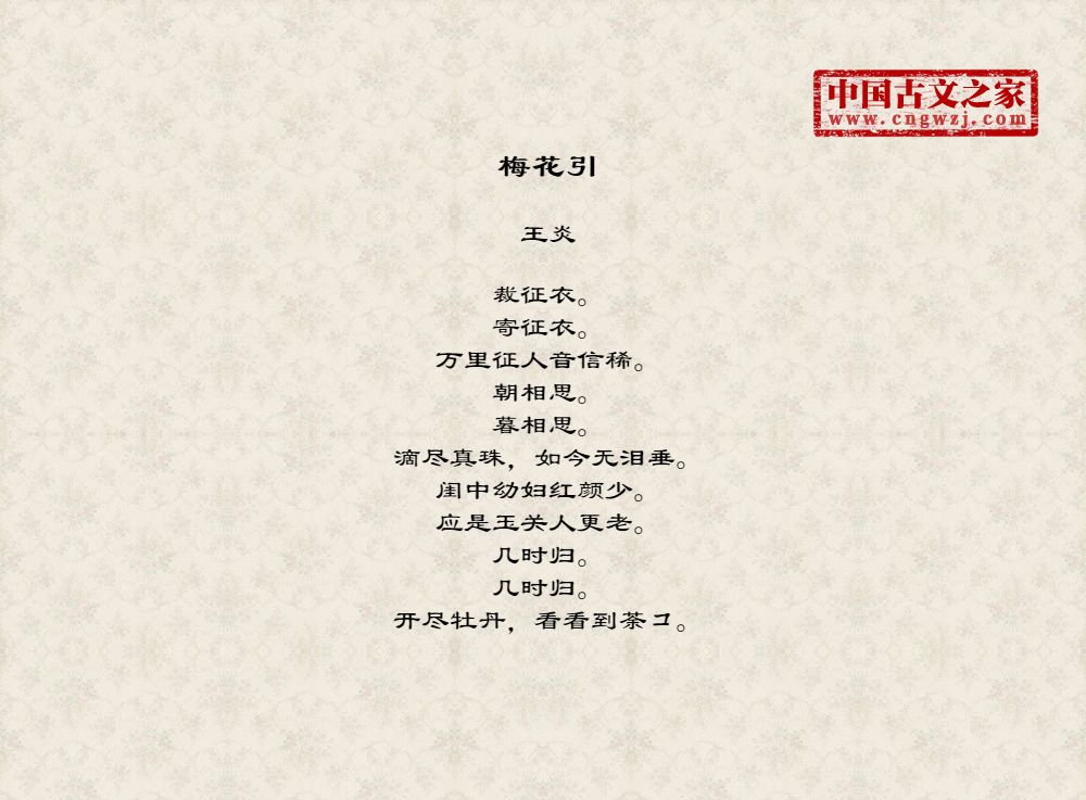 裁征衣。寄征衣。万里征人音信稀。朝相思。暮相思。滴尽真珠,如今无泪垂。闺中幼妇红颜少。应是玉关人更老。几时归。几时归。开尽牡丹,看看到荼コ。