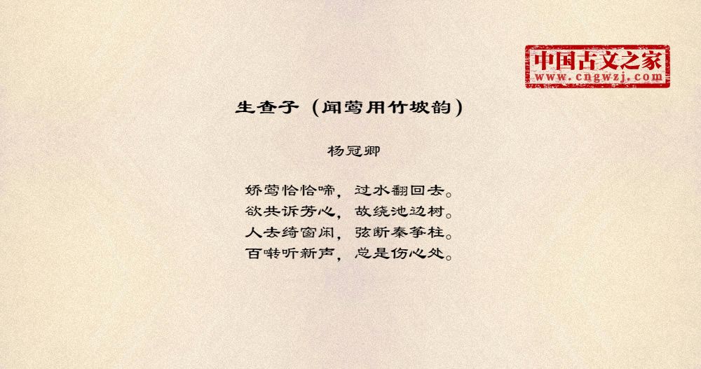 娇莺恰恰啼,过水翻回去。欲共诉芳心,故绕池边树。人去绮窗闲,弦断秦筝柱。百啭听新声,总是伤心处。