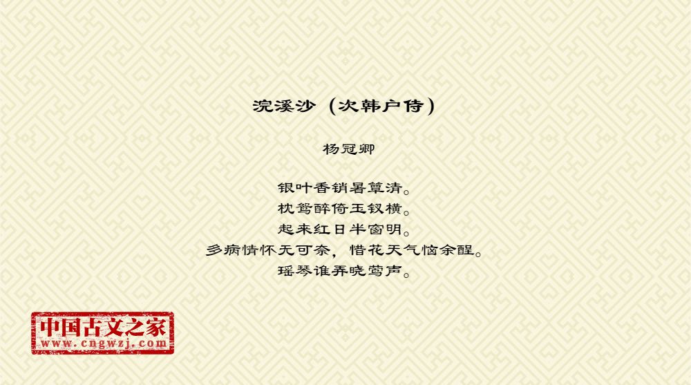 银叶香销暑簟清。枕鸳醉倚玉钗横。起来红日半窗明。多病情怀无可奈,惜花天气恼余酲。瑶琴谁弄晓莺声。