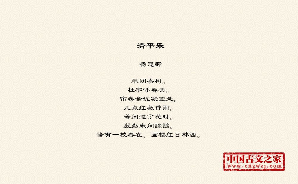 翠团嘉树。杜宇呼春去。帘卷金泥凝望处。几点红薇香雨。等闲过了花时。殷勤来问酴醿。恰有一枝春在,画楼红日林西。