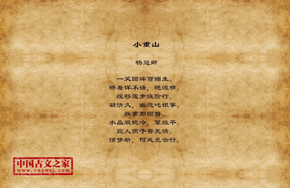 杨冠卿(1138-?)南宋诗人,字梦锡,江陵(今属湖北)人,举进士,为九江戎司掾,又尝知广州,以事罢。晚寓临安。闭门不出,与姜夔等相倡和。冠卿才华清俊