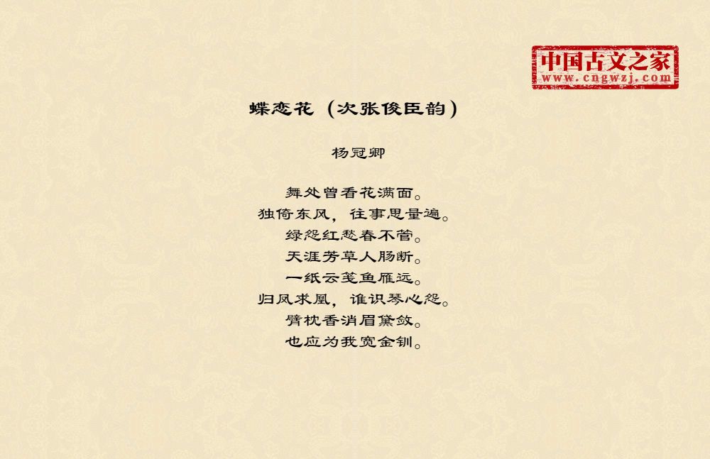 杨冠卿(1138-?)南宋诗人,字梦锡,江陵(今属湖北)人,举进士,为九江戎司掾,又尝知广州,以事罢。晚寓临安。闭门不出,与姜夔等相倡和。冠卿才华清俊