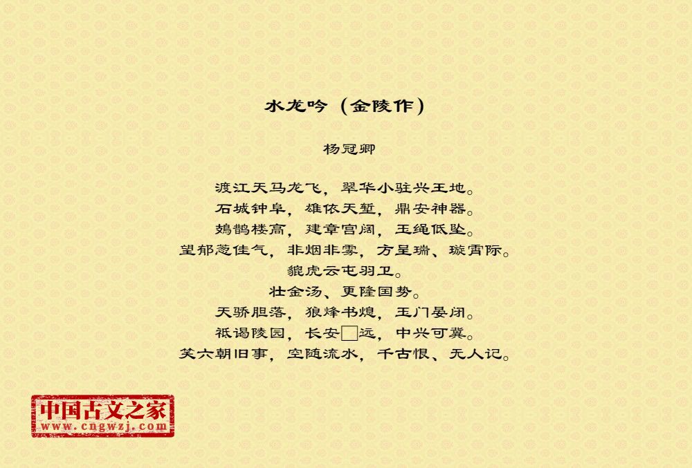 渡江天马龙飞,翠华小驻兴王地。石城钟阜,雄依天堑,鼎安神器。鳷鹊楼高,建章宫阔,玉绳低坠。望郁葱佳气,非烟非雾,方呈瑞、璇霄际。貔虎云屯羽卫。壮金汤、更隆国势。天骄胆落,狼烽书熄,玉门晏闭。祗谒陵园,长安□远,中兴可冀。笑六朝旧事,空随流水,千古恨、无人记。