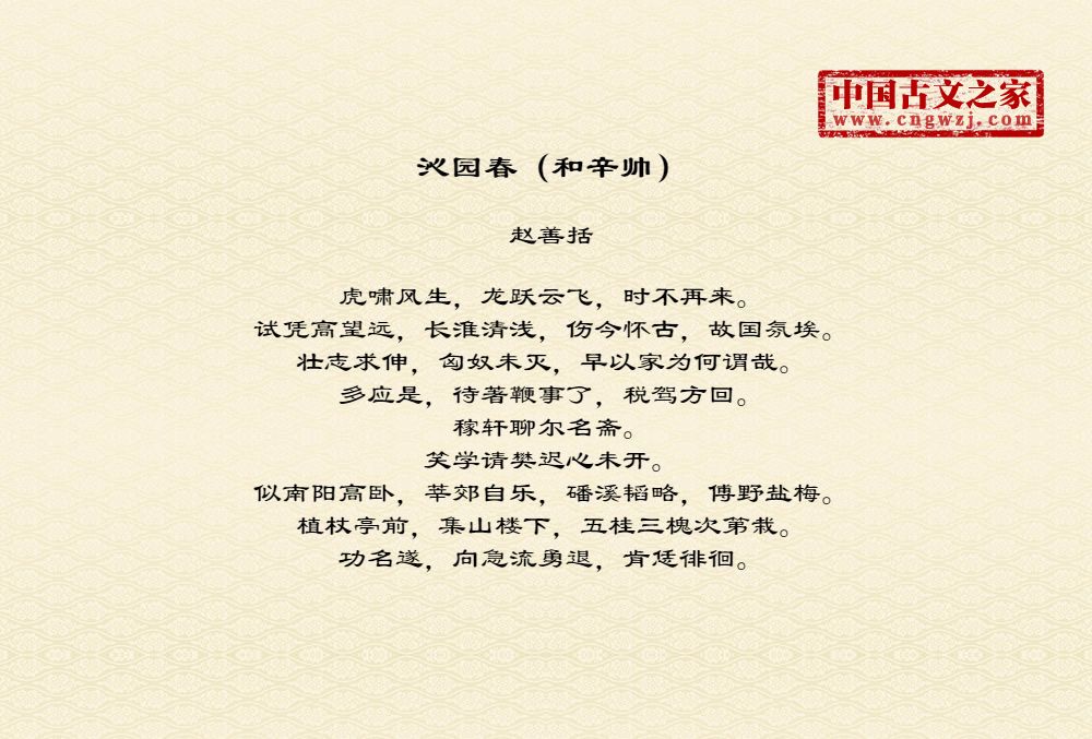 虎啸风生,龙跃云飞,时不再来。试凭高望远,长淮清浅,伤今怀古,故国氛埃。壮志求伸,匈奴未灭,早以家为何谓哉。多应是,待著鞭事了,税驾方回。稼轩聊尔名斋。笑学请樊迟心未开。似南阳高卧,莘郊自乐,磻溪韬略,傅野盐梅。植杖亭前,集山楼下,五桂三槐次第栽。功名遂,向急流勇退,肯恁徘徊。