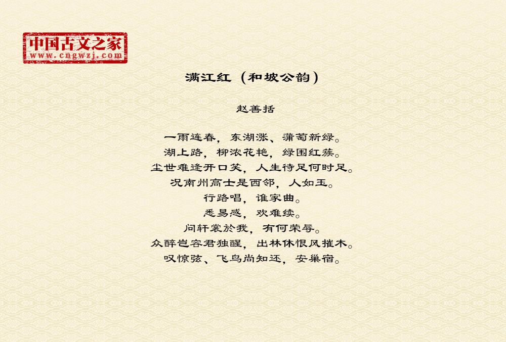 一雨连春,东湖涨、蒲萄新绿。湖上路,柳浓花艳,绿围红簇。尘世难逢开口笑,人生待足何时足。况南州高士是西邻,人如玉。行路唱,谁家曲。悉易感,欢难续。问轩裳於我,有何荣辱。众醉岂容君独醒,出林休恨风摧木。叹惊弦、飞鸟尚知还,安巢宿。