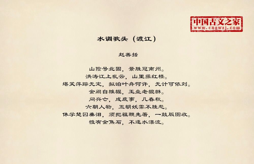 山险号北固,景胜冠南州。洪涛江上乱云,山里簇红楼。堪笑萍踪无定,拟泊叶舟何许,无计可依刘。金阙自帷幄,玉垒老貔貅。问兴亡,成底事,几春秋。六朝人物,五胡妖雾不胜愁。休学楚囚垂泪,须把祖鞭先著,一鼓版图收。惟有金焦石,不逐水漂流。