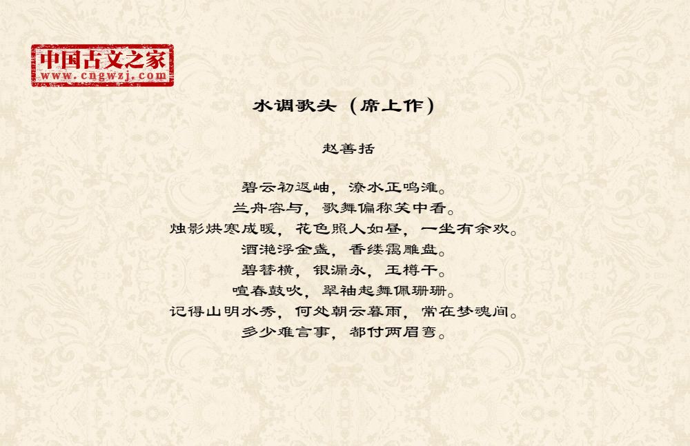 碧云初返岫,潦水正鸣滩。兰舟容与,歌舞偏称笑中看。烛影烘寒成暖,花色照人如昼,一坐有余欢。酒滟浮金盏,香缕霭雕盘。碧簪横,银漏永,玉樽干。喧春鼓吹,翠袖起舞佩珊珊。记得山明水秀,何处朝云暮雨,常在梦魂间。多少难言事,都付两眉弯。