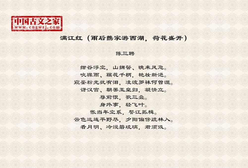 《满江红(雨后携家游西湖,荷花盛开)》的原文打印版(陈三聘)