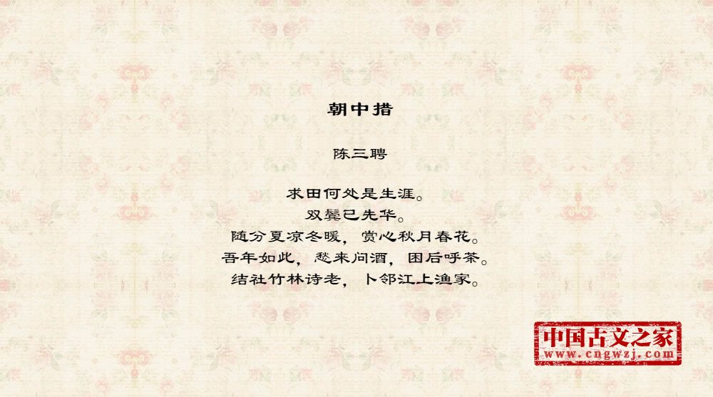 求田何处是生涯。双鬓已先华。随分夏凉冬暖,赏心秋月春花。吾年如此,愁来问酒,困后呼茶。结社竹林诗老,卜邻江上渔家。