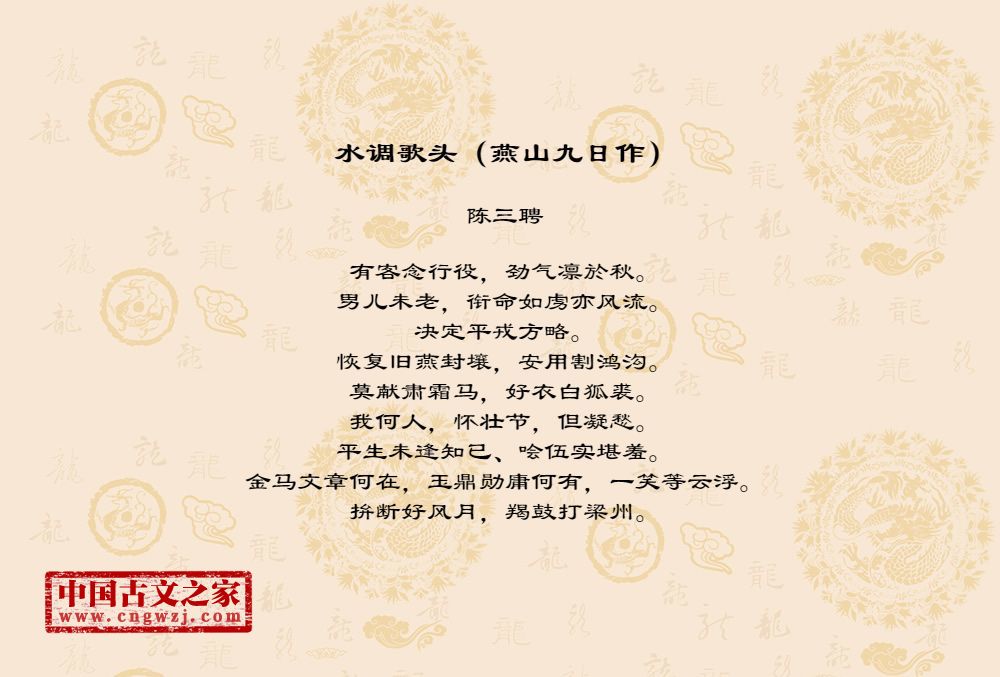陈三聘,宋代诗词家。约公元一一六二年前后在世。字梦弼(或写作“?”),南宋吴郡(今苏州)人。生卒年均不详,约宋高宗绍兴末前后在世。生平事迹无考。工词,