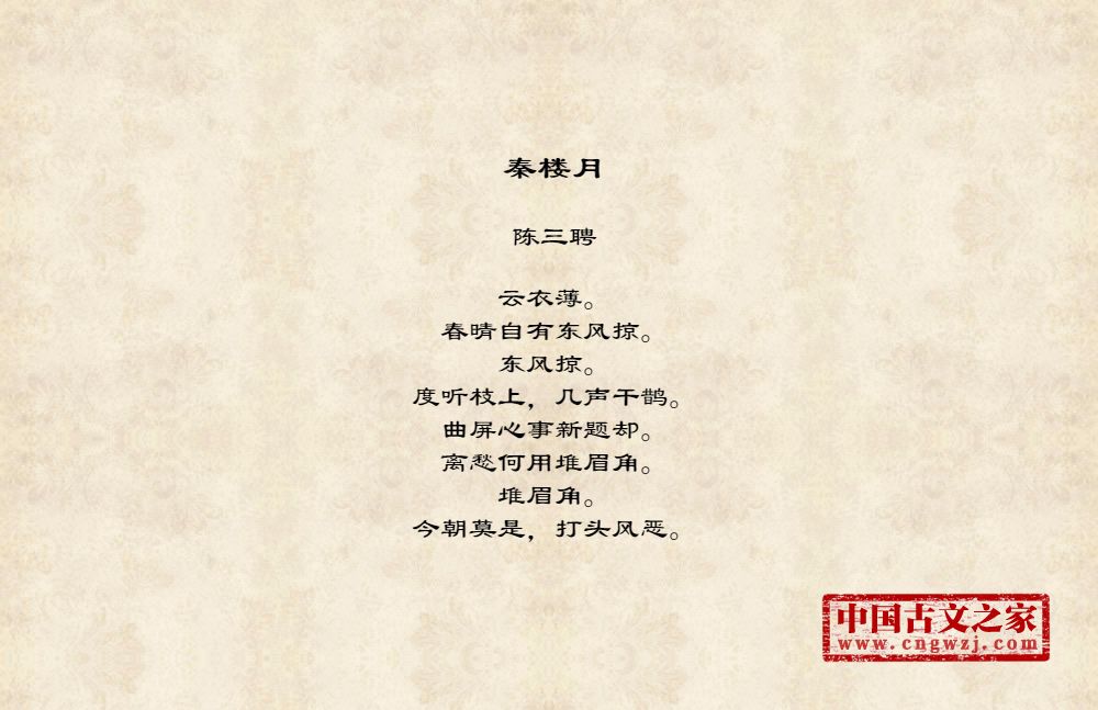 陈三聘,宋代诗词家。约公元一一六二年前后在世。字梦弼(或写作“?”),南宋吴郡(今苏州)人。生卒年均不详,约宋高宗绍兴末前后在世。生平事迹无考。工词,