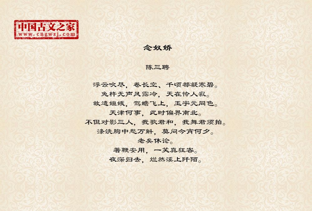 陈三聘,宋代诗词家。约公元一一六二年前后在世。字梦弼(或写作“?”),南宋吴郡(今苏州)人。生卒年均不详,约宋高宗绍兴末前后在世。生平事迹无考。工词,
