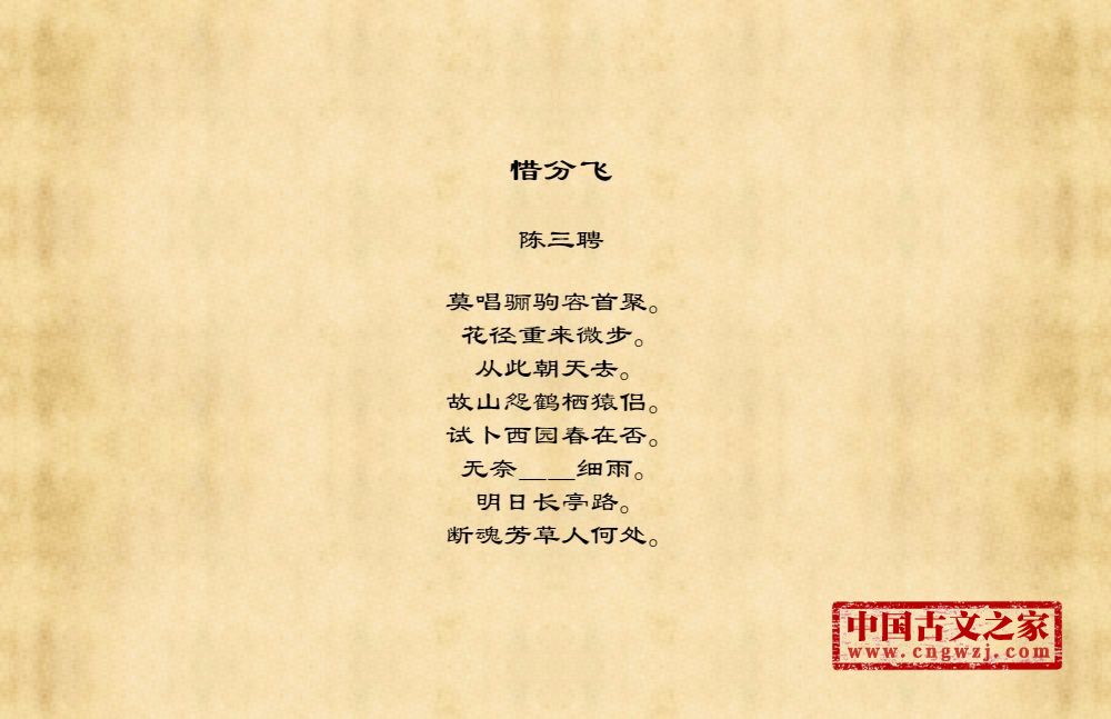 莫唱骊驹容首聚。花径重来微步。从此朝天去。故山怨鹤栖猿侣。试卜西园春在否。无奈__细雨。明日长亭路。断魂芳草人何处。