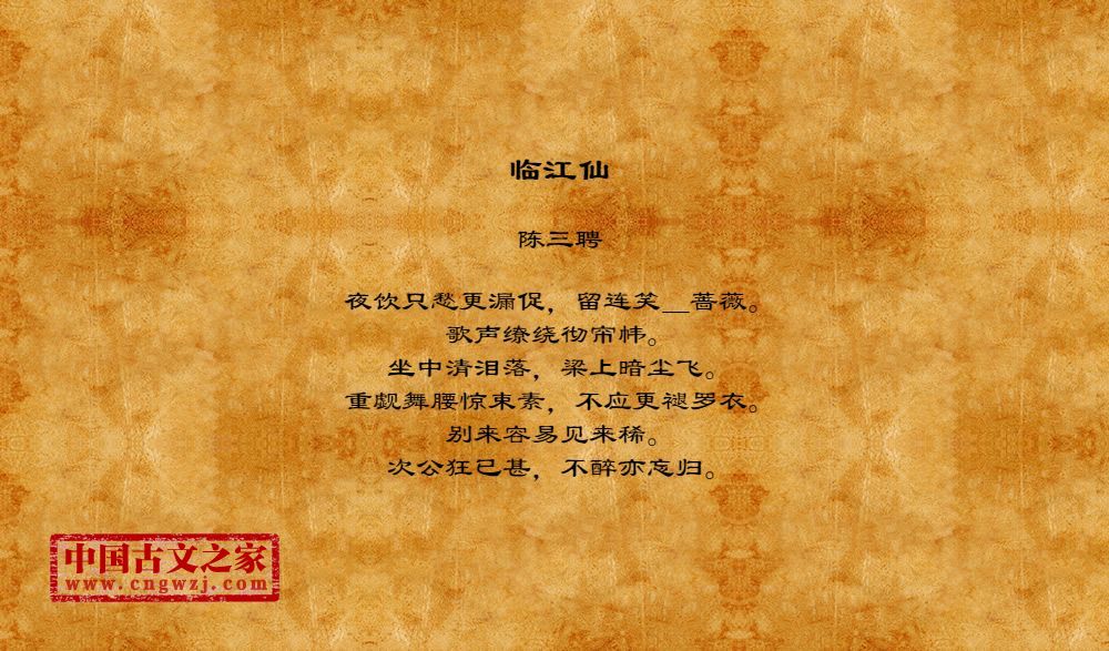陈三聘,宋代诗词家。约公元一一六二年前后在世。字梦弼(或写作“?”),南宋吴郡(今苏州)人。生卒年均不详,约宋高宗绍兴末前后在世。生平事迹无考。工词,