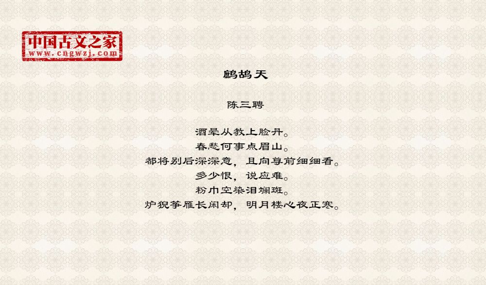 陈三聘,宋代诗词家。约公元一一六二年前后在世。字梦弼(或写作“?”),南宋吴郡(今苏州)人。生卒年均不详,约宋高宗绍兴末前后在世。生平事迹无考。工词,