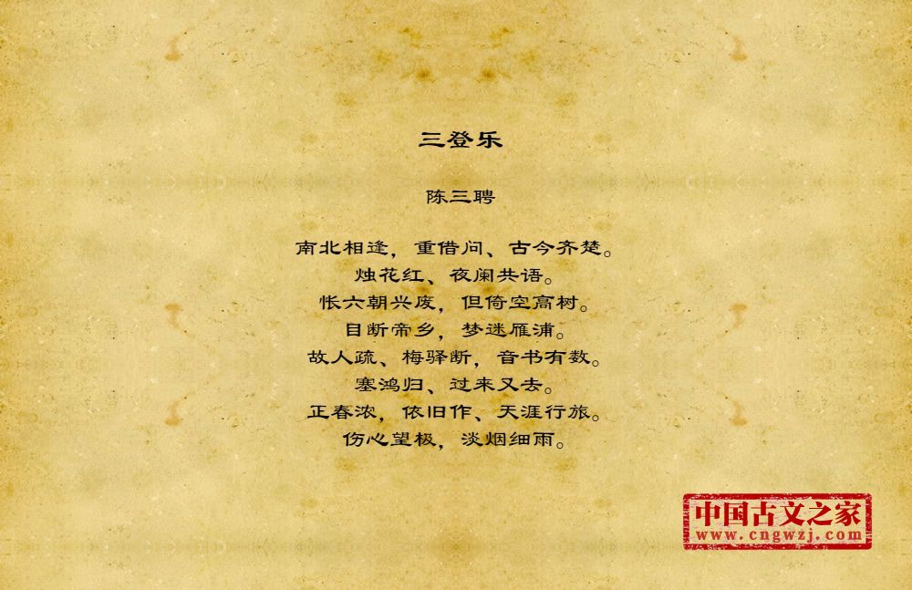 陈三聘,宋代诗词家。约公元一一六二年前后在世。字梦弼(或写作“?”),南宋吴郡(今苏州)人。生卒年均不详,约宋高宗绍兴末前后在世。生平事迹无考。工词,