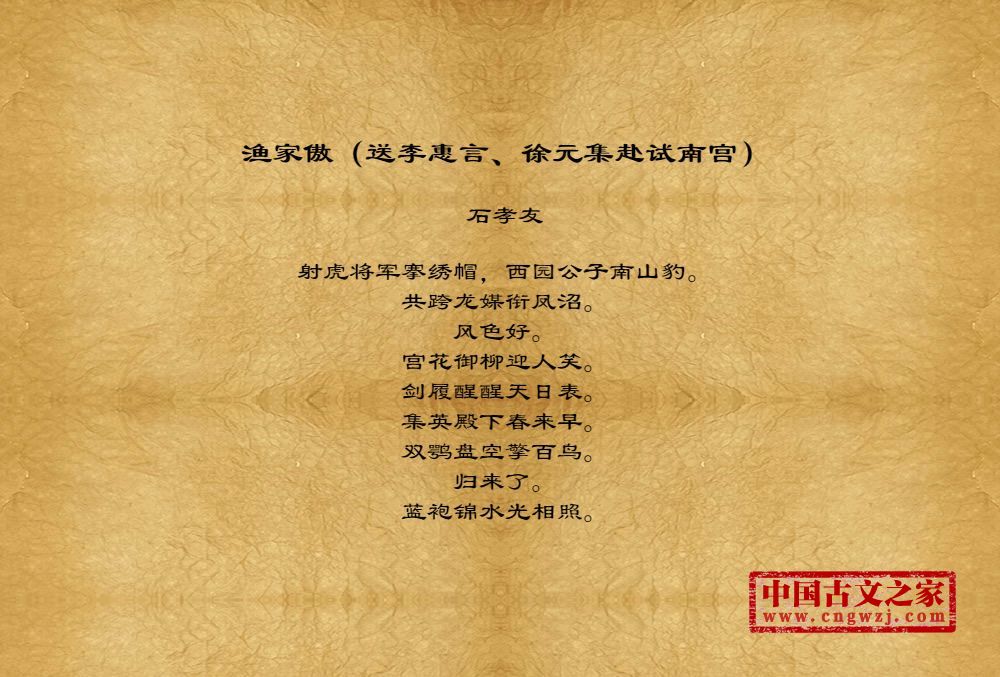 《渔家傲(送李惠言、徐元集赴试南宫)》的原文打印版(石孝友)