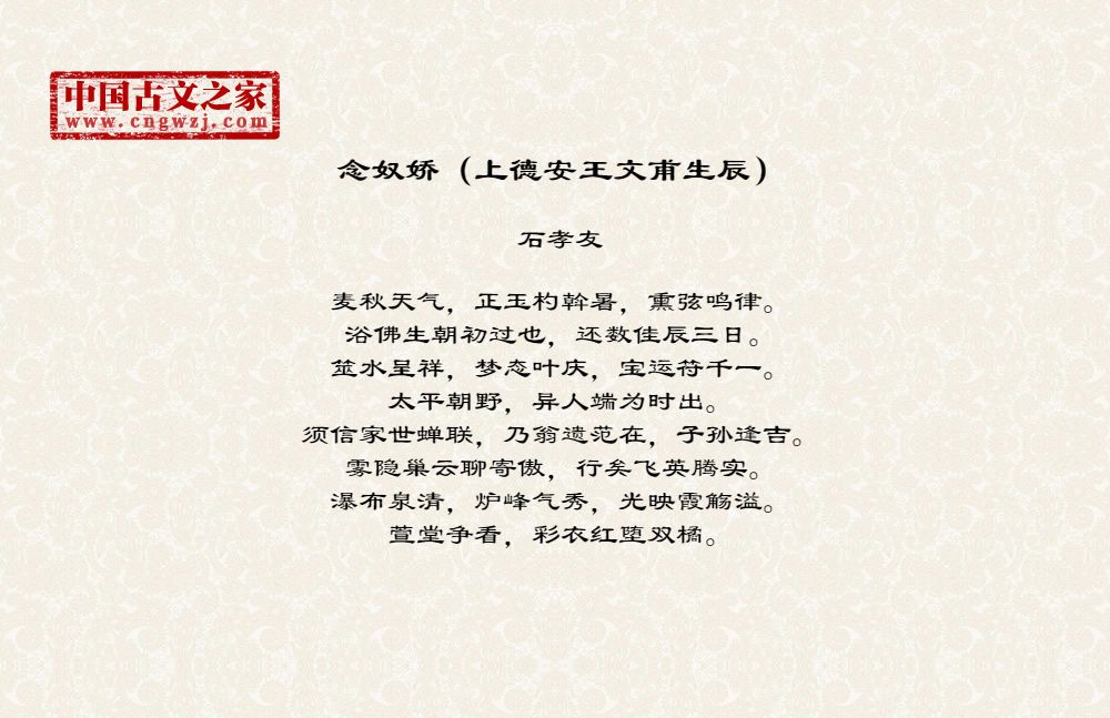 《念奴娇(上德安王文甫生辰)》的原文打印版(石孝友)