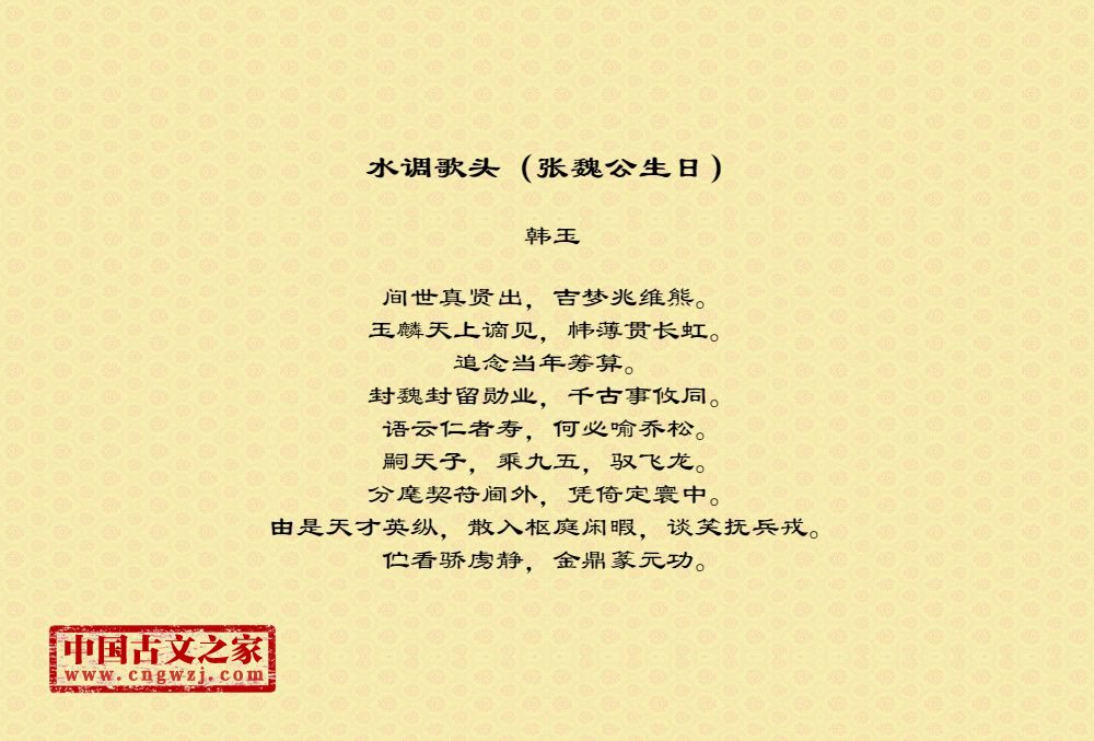 间世真贤出,吉梦兆维熊。玉麟天上谪见,帏薄贯长虹。追念当年筹算。封魏封留勋业,千古事攸同。语云仁者寿,何必喻乔松。嗣天子,乘九五,驭飞龙。分麾契符阃外,凭倚定寰中。由是天才英纵,散入枢庭闲暇,谈笑抚兵戎。伫看骄虏静,金鼎篆元功。