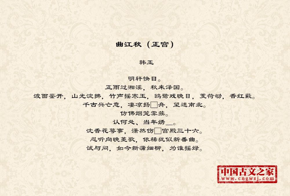 明轩快目。正雨过湘溪,秋来泽国。波面鉴开,山光淀拂,竹声摇寒玉,鸥鹭戏晚日,芰荷动,香红蔌。千古兴亡意,凄凉扬□舟,望迷南北。仿佛烟笼雾簇。认何处、当年绣_。沈香花萼事,潇然伤□宫殿三十六。忍听向晚菱歌,依稀犹似新番曲。试与问,如今新蒲细柳,为谁摇绿。