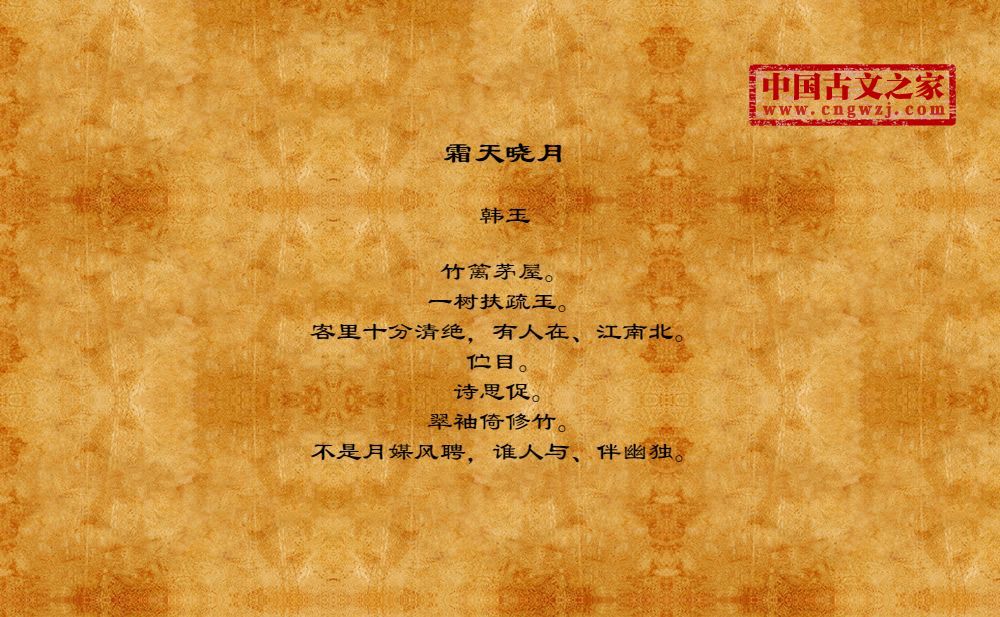 竹篱茅屋。一树扶疏玉。客里十分清绝,有人在、江南北。伫目。诗思促。翠袖倚修竹。不是月媒风聘,谁人与、伴幽独。