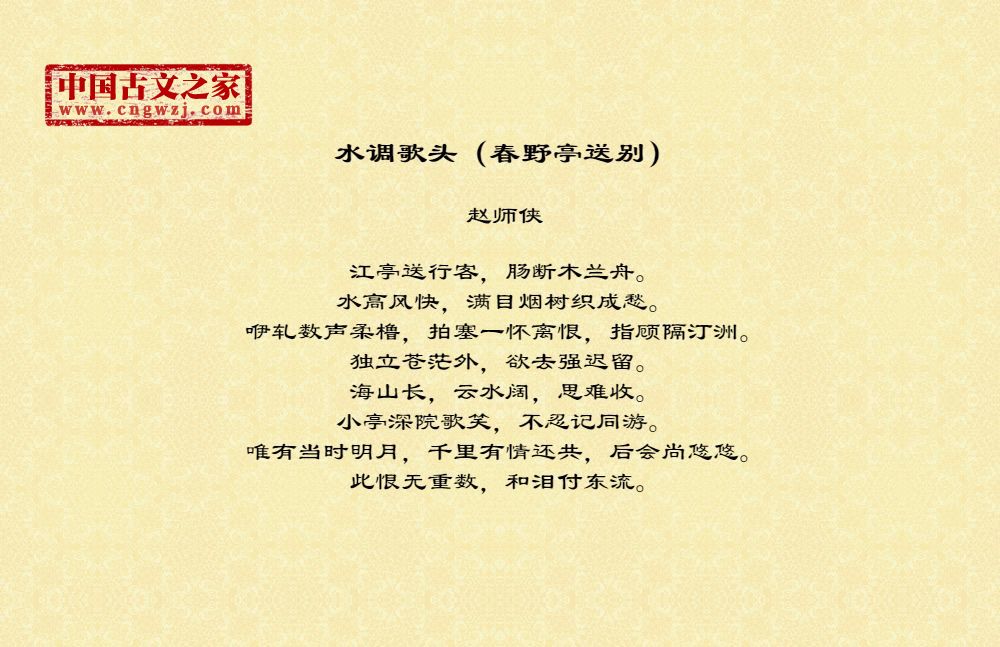 江亭送行客,肠断木兰舟。水高风快,满目烟树织成愁。咿轧数声柔橹,拍塞一怀离恨,指顾隔汀洲。独立苍茫外,欲去强迟留。海山长,云水阔,思难收。小亭深院歌笑,不忍记同游。唯有当时明月,千里有情还共,后会尚悠悠。此恨无重数,和泪付东流。