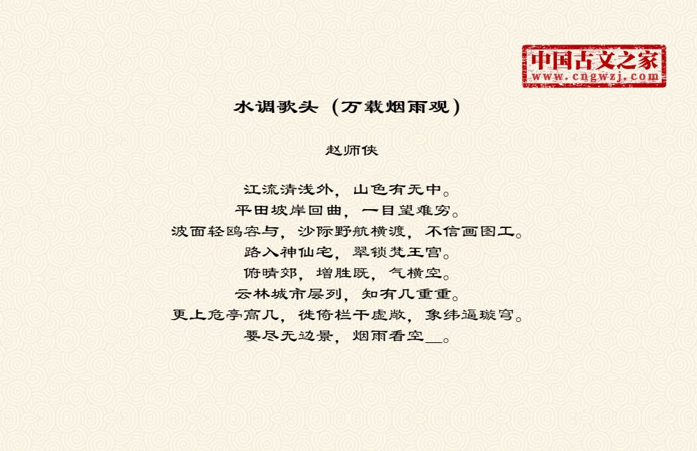 江流清浅外,山色有无中。平田坡岸回曲,一目望难穷。波面轻鸥容与,沙际野航横渡,不信画图工。路入神仙宅,翠锁梵王宫。俯晴郊,增胜既,气横空。云林城市层列,知有几重重。更上危亭高几,徙倚栏干虚敞,象纬逼璇穹。要尽无边景,烟雨看空_。