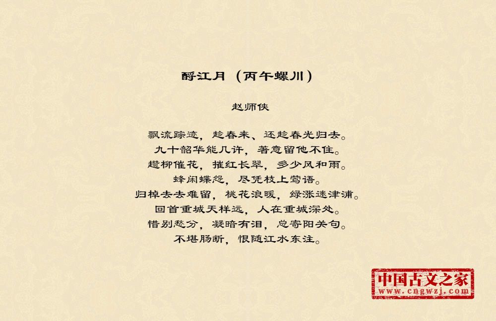飘流踪迹,趁春来、还趁春光归去。九十韶华能几许,著意留他不住。趱柳催花,摧红长翠,多少风和雨。蜂闲蝶怨,尽凭枝上莺语。归棹去去难留,桃花浪暖,绿涨迷津浦。回首重城天样远,人在重城深处。惜别愁分,凝暗有泪,总寄阳关句。不堪肠断,恨随江水东注。
