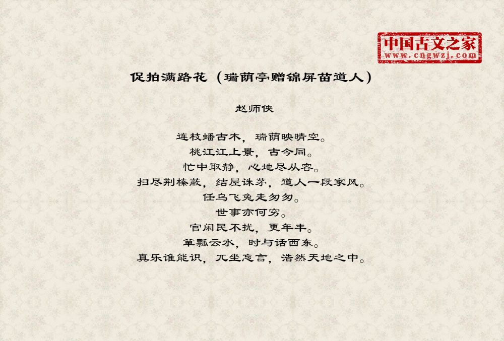 《促拍满路花(瑞荫亭赠锦屏苗道人)》的原文打印版(赵师侠)