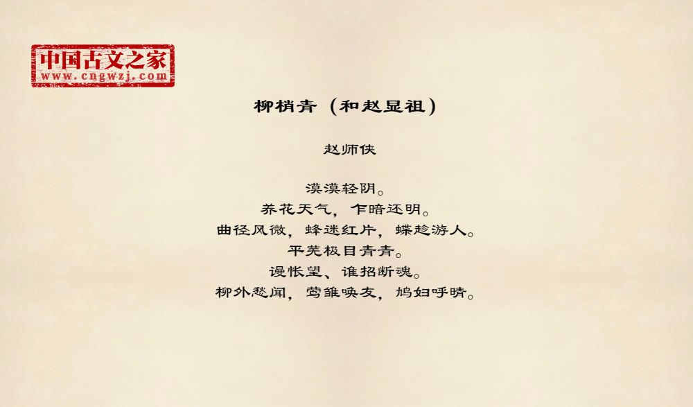 漠漠轻阴。养花天气,乍暗还明。曲径风微,蜂迷红片,蝶趁游人。平芜极目青青。谩怅望、谁招断魂。柳外愁闻,莺雏唤友,鸠妇呼晴。
