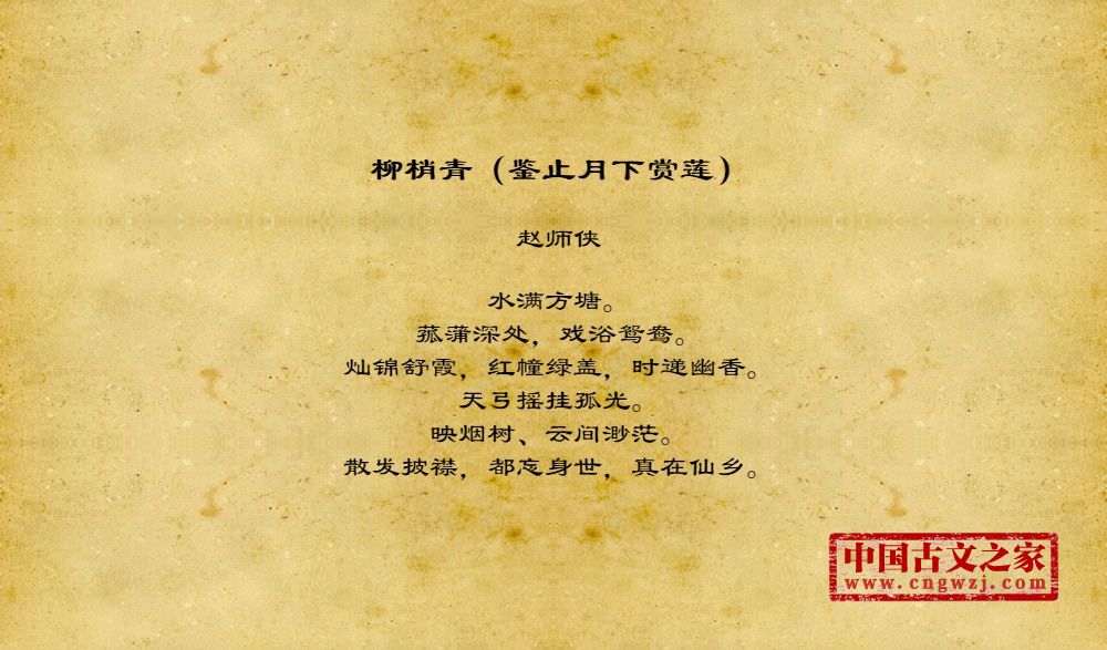 水满方塘。菰蒲深处,戏浴鸳鸯。灿锦舒霞,红幢绿盖,时递幽香。天弓摇挂孤光。映烟树、云间渺茫。散发披襟,都忘身世,真在仙乡。
