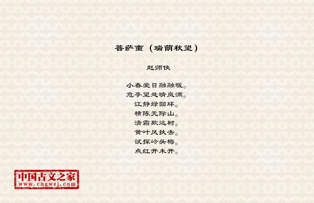 小春爱日融融暖。危亭望处晴岚满。江静绿回环。横陈无际山。清霜欺远树。黄叶风扶去。试探岭头梅。点红开未开。