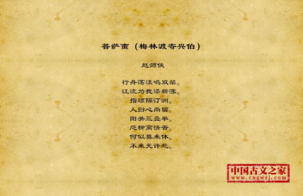 行舟荡漾鸣双桨。江流为我添新涨。指顾隔汀洲。人归心尚留。阳关三叠举。怨柳离情苦。何似莫来休。不来无许愁。