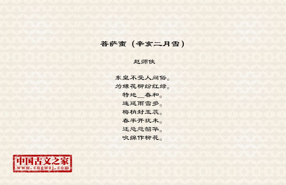 东皇不受人间俗。为嫌花柳纷红绿。特地_春和。连延雨雪多。梅梢封玉蕊。春半开犹未。还恐怨韶华。吹绵作柳花。