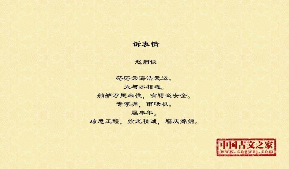 茫茫云海浩无边。天与水相连。舳舻万里来往,有祷必安全。专掌握,雨旸权。属丰年。琼卮玉醴,飨此精诚,福庆绵绵。