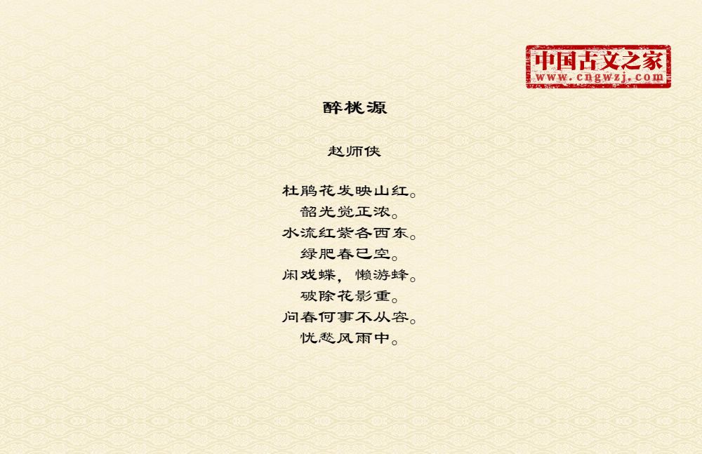 杜鹃花发映山红。韶光觉正浓。水流红紫各西东。绿肥春已空。闲戏蝶,懒游蜂。破除花影重。问春何事不从容。忧愁风雨中。