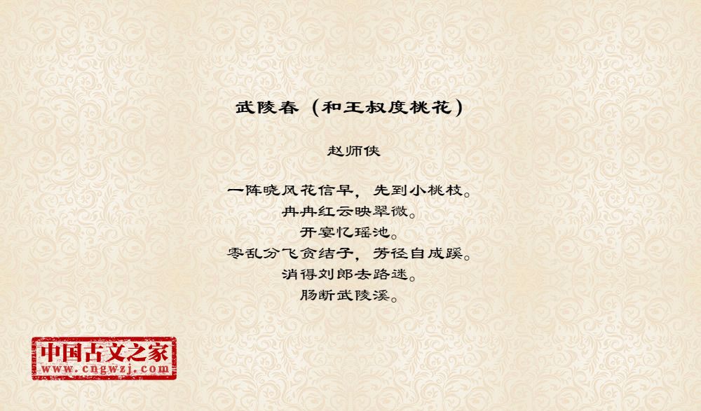 一阵晓风花信早,先到小桃枝。冉冉红云映翠微。开宴忆瑶池。零乱分飞贪结子,芳径自成蹊。消得刘郎去路迷。肠断武陵溪。