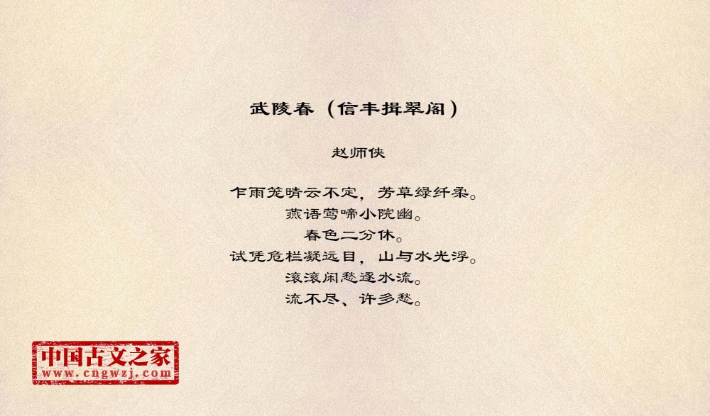 乍雨笼晴云不定,芳草绿纤柔。燕语莺啼小院幽。春色二分休。试凭危栏凝远目,山与水光浮。滚滚闲愁逐水流。流不尽、许多愁。