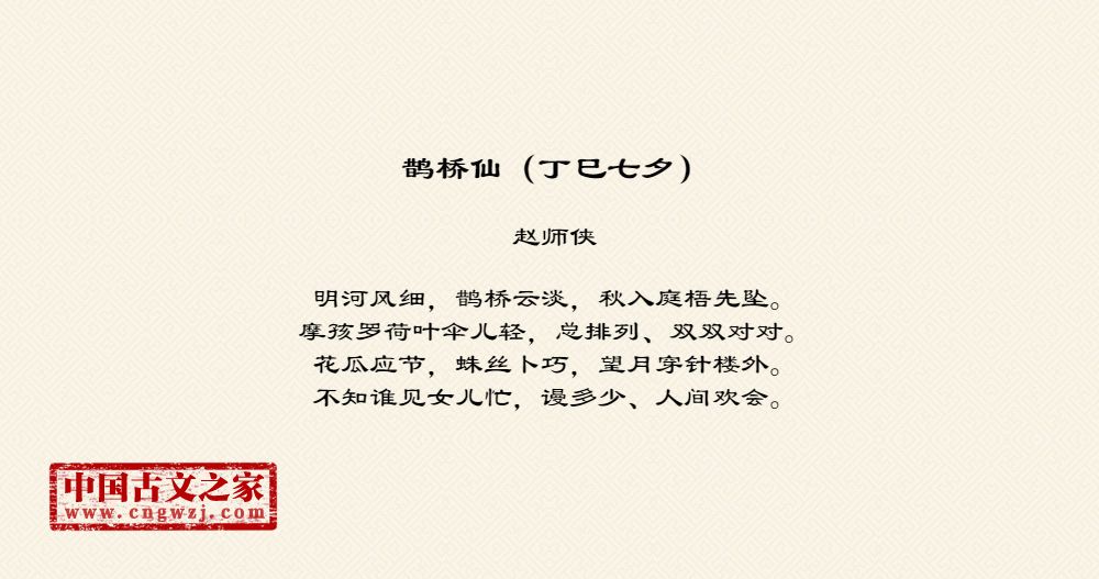 明河风细,鹊桥云淡,秋入庭梧先坠。摩孩罗荷叶伞儿轻,总排列、双双对对。花瓜应节,蛛丝卜巧,望月穿针楼外。不知谁见女儿忙,谩多少、人间欢会。
