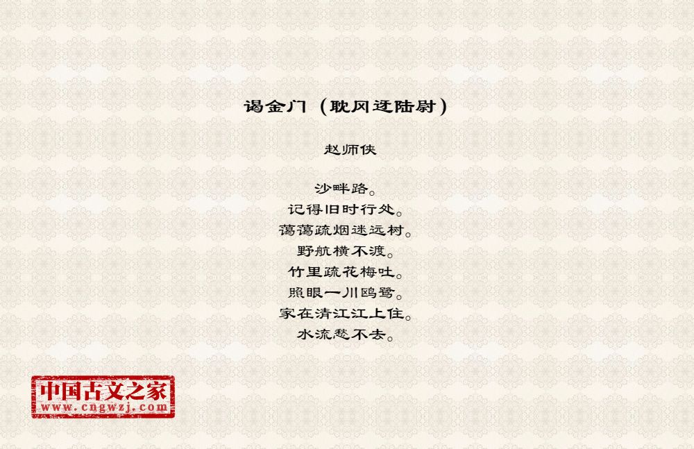沙畔路。记得旧时行处。蔼蔼疏烟迷远树。野航横不渡。竹里疏花梅吐。照眼一川鸥鹭。家在清江江上住。水流愁不去。
