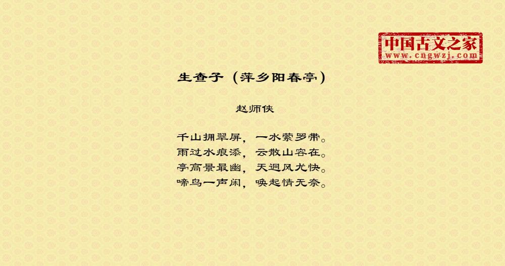 千山拥翠屏,一水萦罗带。雨过水痕添,云散山容在。亭高景最幽,天迥风尤快。啼鸟一声闲,唤起情无奈。