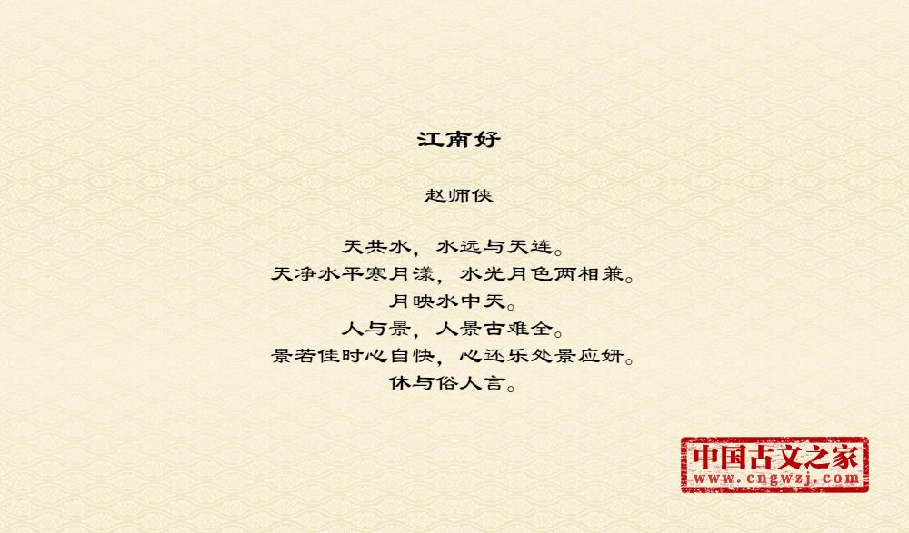 天共水,水远与天连。天净水平寒月漾,水光月色两相兼。月映水中天。人与景,人景古难全。景若佳时心自快,心还乐处景应妍。休与俗人言。