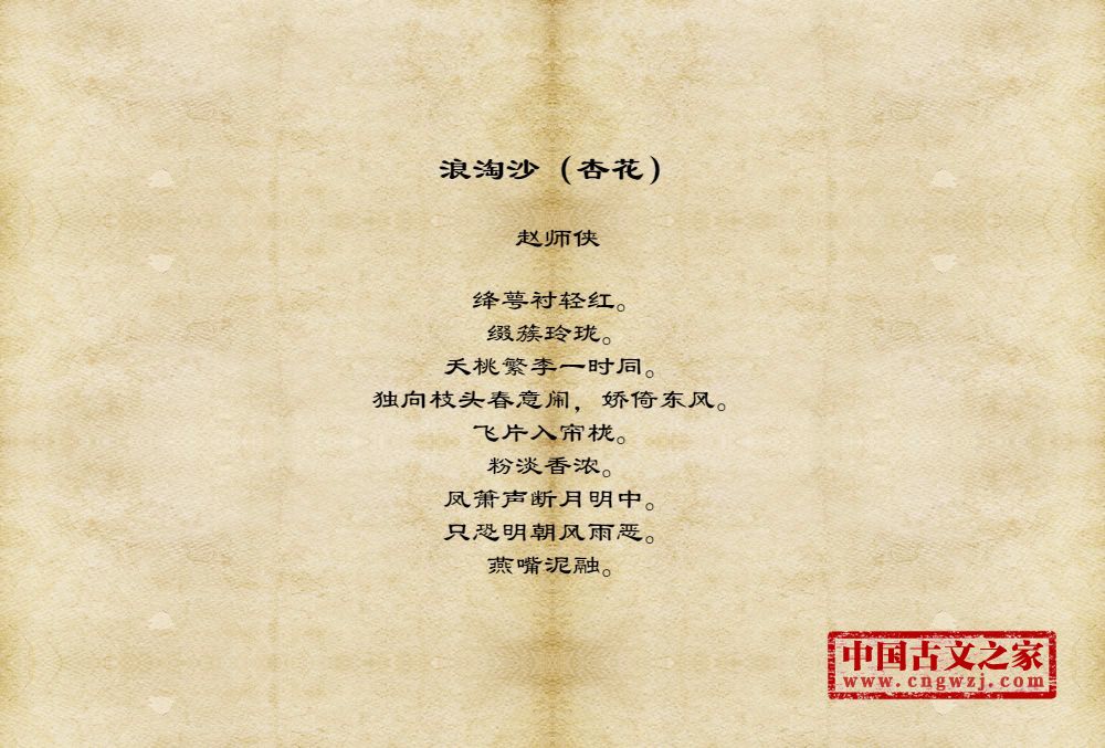 赵师侠(生卒年不详)一名师使,字介之,号坦庵,太祖子燕王赵德昭七世孙,居于新淦(今江西新干)。淳熙二年(1175)进士。十五年为江华郡丞。饶宗颐《词籍
