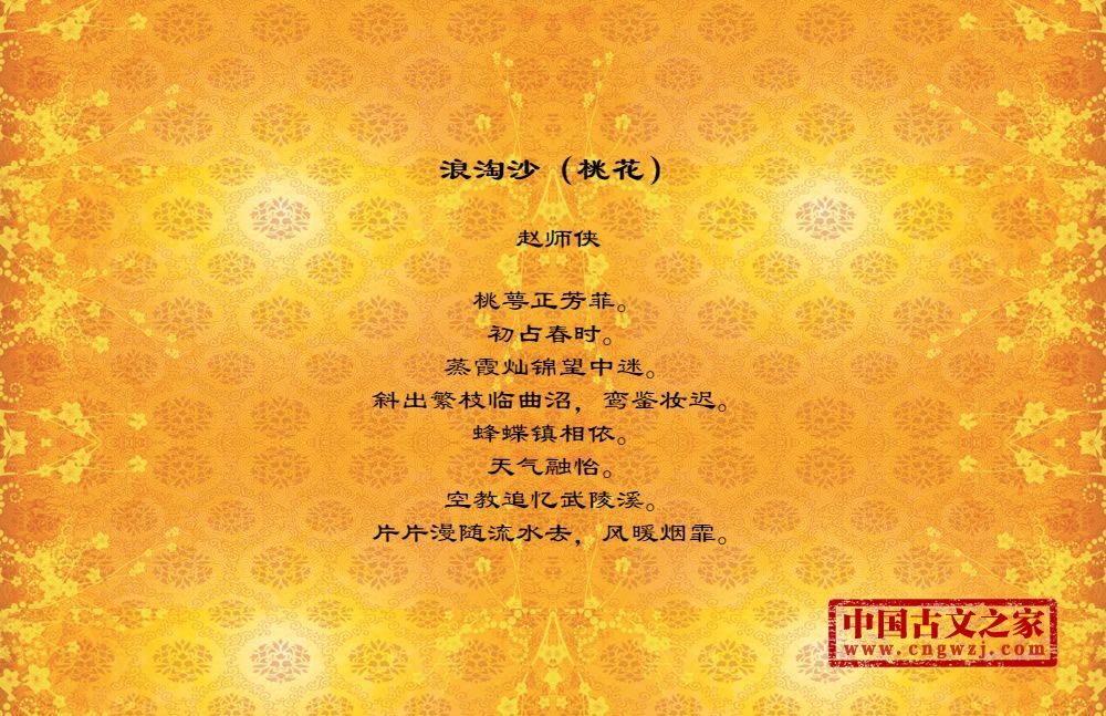 赵师侠(生卒年不详)一名师使,字介之,号坦庵,太祖子燕王赵德昭七世孙,居于新淦(今江西新干)。淳熙二年(1175)进士。十五年为江华郡丞。饶宗颐《词籍