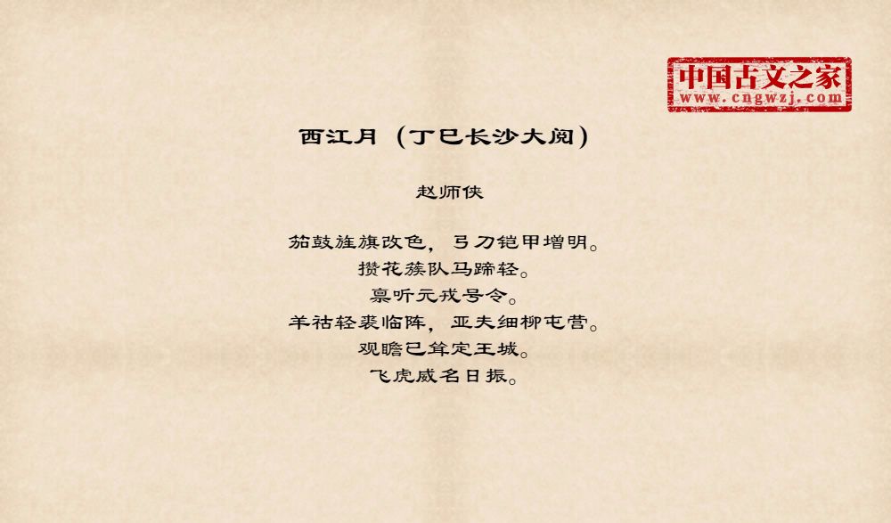 笳鼓旌旗改色,弓刀铠甲增明。攒花簇队马蹄轻。禀听元戎号令。羊祜轻裘临阵,亚夫细柳屯营。观瞻已耸定王城。飞虎威名日振。
