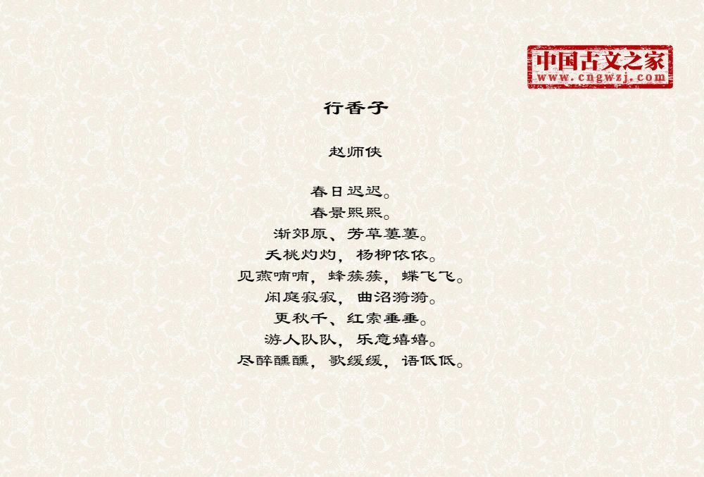 春日迟迟。春景熙熙。渐郊原、芳草萋萋。夭桃灼灼,杨柳依依。见燕喃喃,蜂簇簇,蝶飞飞。闲庭寂寂,曲沼漪漪。更秋千、红索垂垂。游人队队,乐意嬉嬉。尽醉醺醺,歌缓缓,语低低。