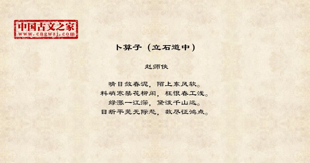 晴日敛春泥,陌上东风软。料峭寒禁花柳闲,枉恨春工浅。绿涨一江深,黛泼千山远。目断平芜无际愁,数尽征鸿点。
